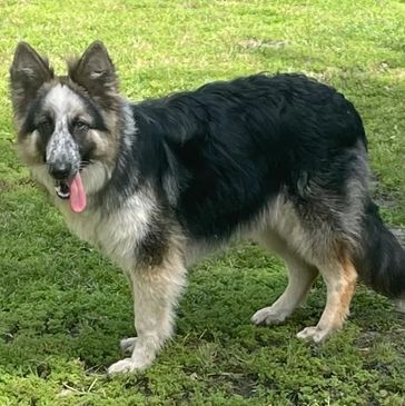 Sassy is an AKC registered long haired black and tan Panda German Shepherd. She Is Genetically cleared through Embark. She carries for solid white, blue, roan, and Panda.